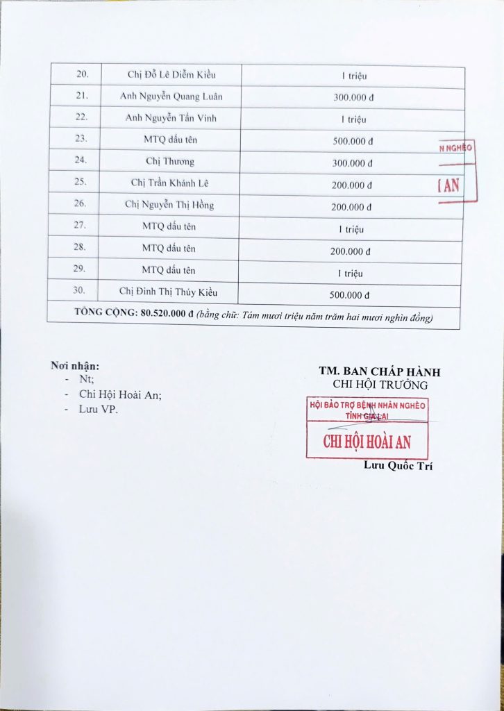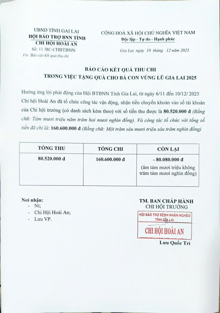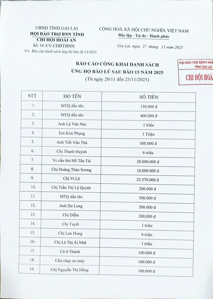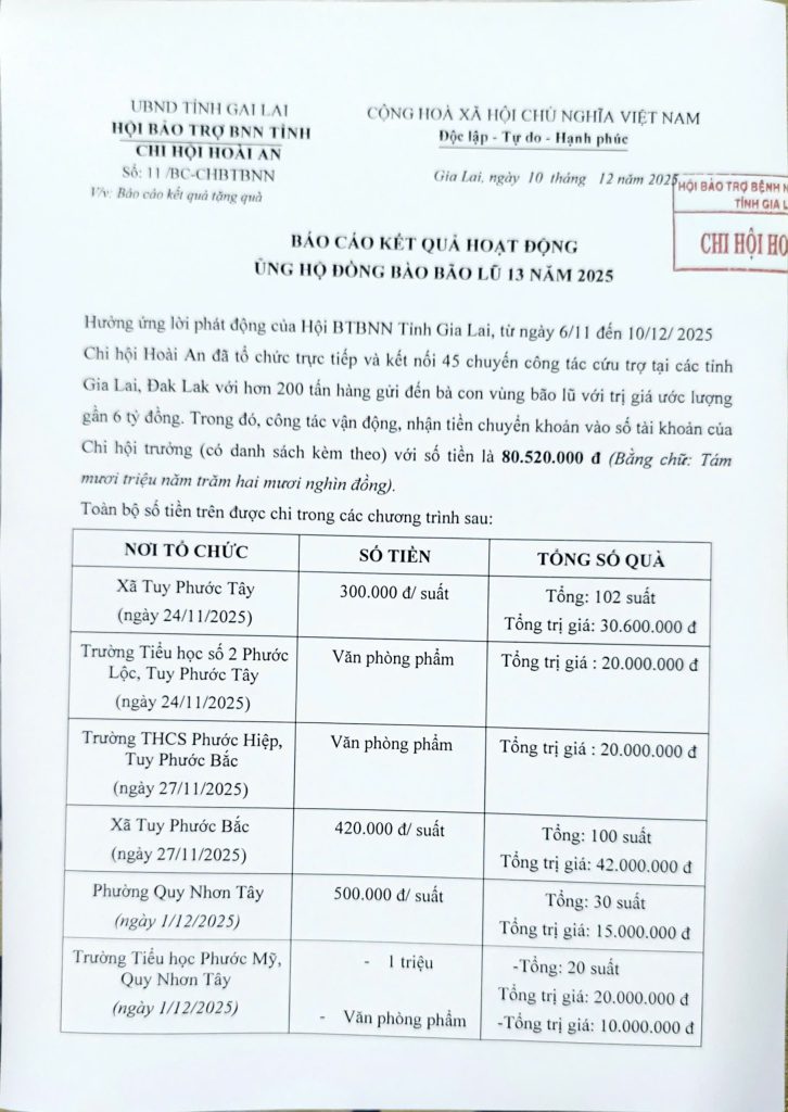 Hưởng ứng lời phát động của Hội BTBNN Tỉnh Gia Lai, từ ngày 6/11 đến 10/12/ 2025. Chi hội Hoài An đã tổ chức trực tiếp và kết nối 45 chuyến công tác cứu trợ tại các tỉnh Gia Lai, Đak Lak với hơn 200 tấn hàng gửi đến bà con vùng bão lũ với trị giá ước lượng gần 6 tỷ đồng.